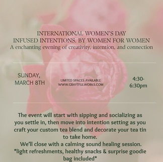 Join us for a special celebration of International Women's Day, where women come together to empower and uplift one another. This unique event, titled "An Evening of Infused Intentions," will provide a nurturing space for connection and creativity.